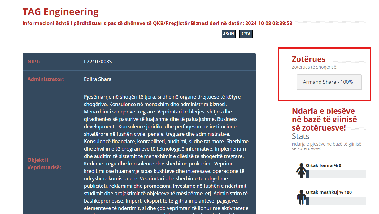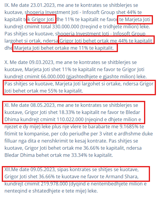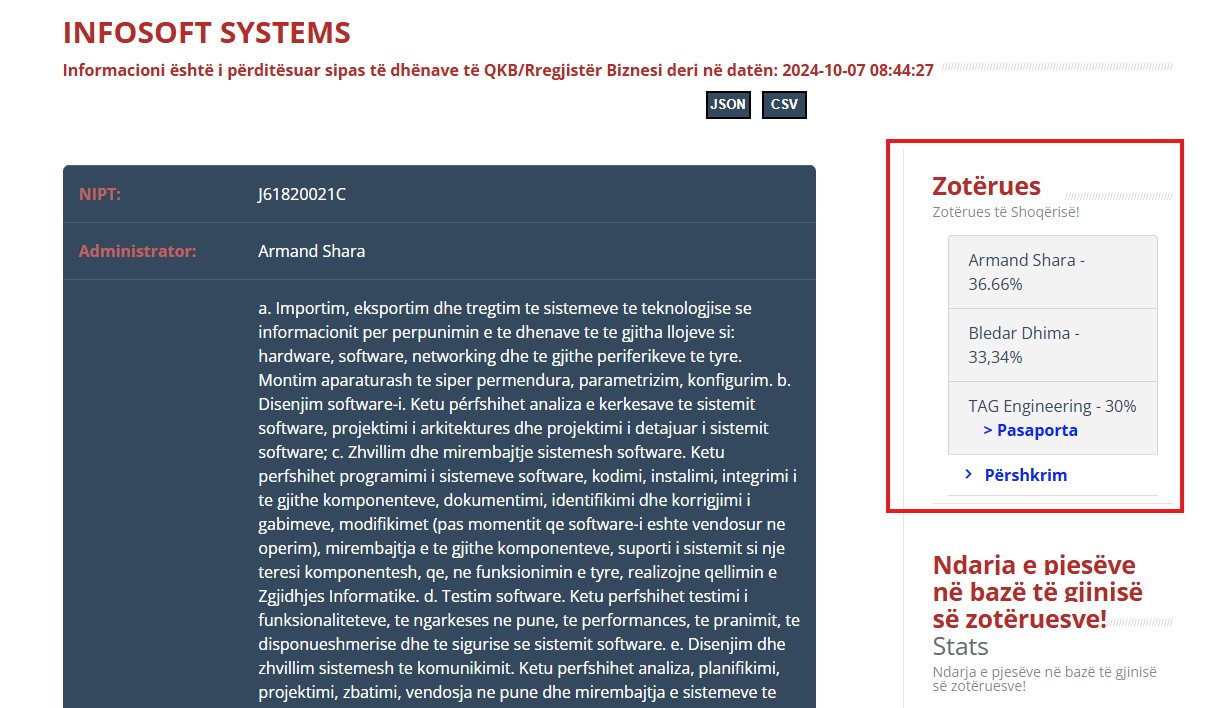 Fituesi i shpallur është një emër që çdo shqiptari i kujton menjëherë Grigor Jotin. Megjithëse në dokumente pronar figuron Armand Sharra, dyshimet e forta janë se ky i fundit është thjesht një "zar" në tavolinën e madhe të pokerit të tenderave. Joti ia "shiti" aksionet Sharrës vetëm 3 vite më parë, por aroma e Infosoft-it të vjetër ndihet në çdo kontratë të majmë që del nga magjia e AKSHI-t, duke na treguar se pronësia ndryshon me letra, por zakoni jo.