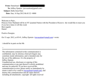 Në mesazhet e publikuara nga Departamenti Amerikan i Drejtësisë, dosja Jeffrey Epstein, përmendet edhe ish-presidentja e Kosovës, Atifete Jahjaga, e cila mbante këtë pozicion në vitin 2012. Në një email të dërguar nga një person me emrin “Daniel”, identiteti i të cilit mbetet i panjohur, thuhet: