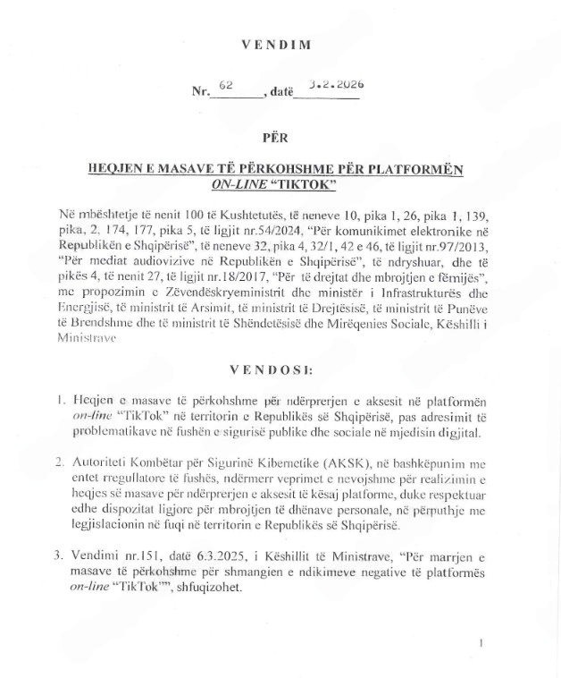 Pas gati një viti bllokimi total, qeveria shqiptare ka vendosur sot, më 4 shkurt 2026, të rihapë aplikacionin TikTok për përdoruesit në Shqipëri. Vendimi u mor në mbledhjen e Këshillit të Ministrave, duke i dhënë fund masës që u ndërmor në mars 2025 pas vrasjes tragjike të 14-vjeçarit Martin Cani. Në atë kohë, qeveria e kryeministrit Edi Rama e justifikoi mbylljen e platformës si një hap të fortë për mbrojtjen e fëmijëve dhe për frenimin e dhunës dhe bullizmit online, duke e paraqitur TikTok-un si një nga faktorët nxitës të këtyre fenomeneve.