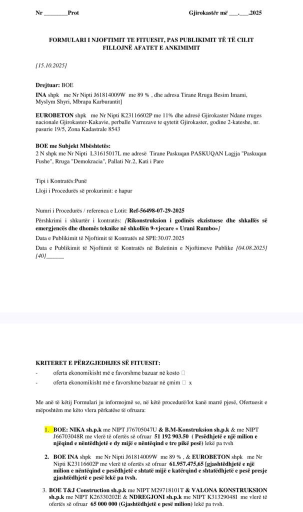 Ka dyshime se Flamur Golemi është përfshirë në një skemë korrupsioni me vlerë rreth 620 mijë euro, në bashkëpunim me biznesmenët Ferdinant Çaushi dhe Isuf Meçi, lidhur me tenderin për rikonstruksionin e godinës ekzistuese, shkallës së emergjencës dhe dhomës teknike në shkollën 9-vjeçare “Urani Rumbo” në Gjirokastër. Në tetor 2025, Bashkia Gjirokastër shpalli fituese kompanitë Ina shpk dhe Eurobeton shpk, me fond limit 780 mijë euro, ndërsa oferta fituese ishte 620 mijë euro. Sipas burimeve, punimet në objekt janë kryer nga ekipe të Bashkisë Gjirokastër, ndërkohë që pagesat janë marrë nga kompanitë fituese, të cilat dyshohet se kanë ndarë paratë me kryebashkiakun. Biznesmenët Çaushi dhe Meçi përmenden gjithashtu si përfitues të një tjetër tenderi prej 400 mijë eurosh për rrugën Zhulat–Gjirokastër, loti I, çka forcon dyshimet për një skemë të përsëritur abuzimi me fondet publike.