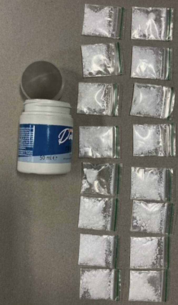 Gjatë kontrollit në automjet, policia gjeti 16 doza të ndara kokaine, të fshehura brenda një shisheje deodoranti, si dhe një shumë parash cash dhe disa telefona celularë.