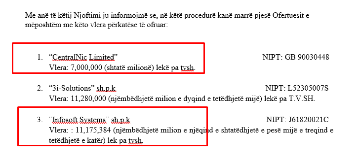 Sipas dokumenteve të procedurës, fituese u shpall kompania INFOSOFT SYSTEMS, në pronësi të Grigor Joti, me një ofertë prej 11,175,384 lekë të reja pa TVSH, ose afro 99% e fondit limit. Ndërkohë, një tjetër kompani kishte paraqitur ofertë prej vetëm 7,000,000 lekë të reja pa TVSH, rreth 40 milionë lekë të vjetra më pak, por nuk u kualifikua. Ky diferencim i madh mes ofertave dhe fakti që u shpall fituese një ofertë pothuajse sa fondi limit ka shtuar dyshimet mbi mënyrën e vlerësimit.