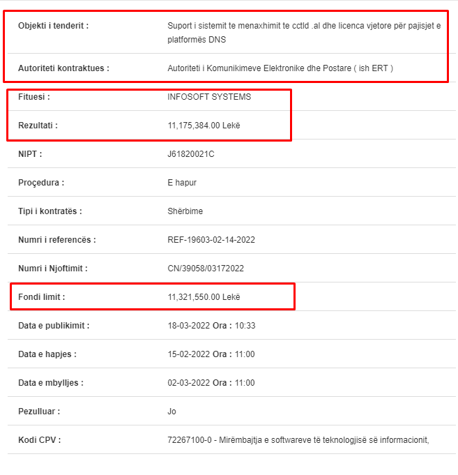 Sot do të kujtojmë një nga tenderët më të diskutuar të AKEP, i zhvilluar në vitin 2022, në kohën kur në krye të institucionit ishte Tomi Frashëri. Bëhet fjalë për procedurën me numër reference REF-19603-02-14-2022, me objekt “Suport i sistemit të menaxhimit të cctld .al dhe licenca vjetore për pajisjet e platformës DNS”. Fondi limit i këtij tenderi ishte 11,321,550 lekë të reja pa TVSH, ose rreth 140 milionë lekë të vjetra me TVSH, ndërsa në garë morën pjesë vetëm 3 kompani, një pjesëmarrje e kufizuar që ka ngritur pikëpyetje.