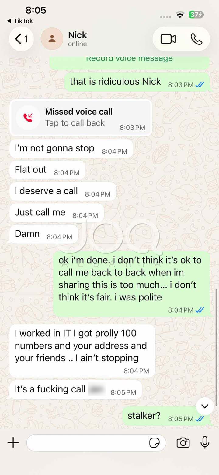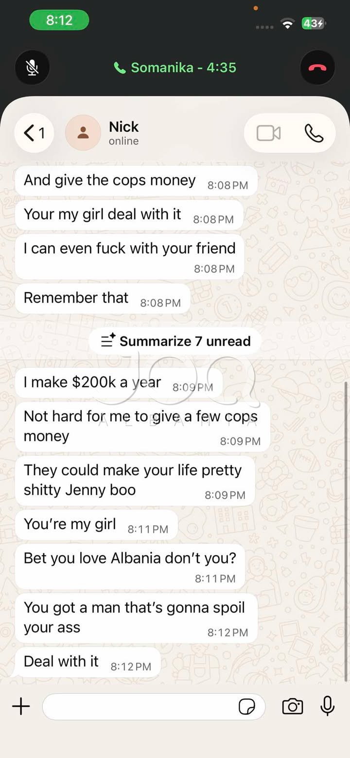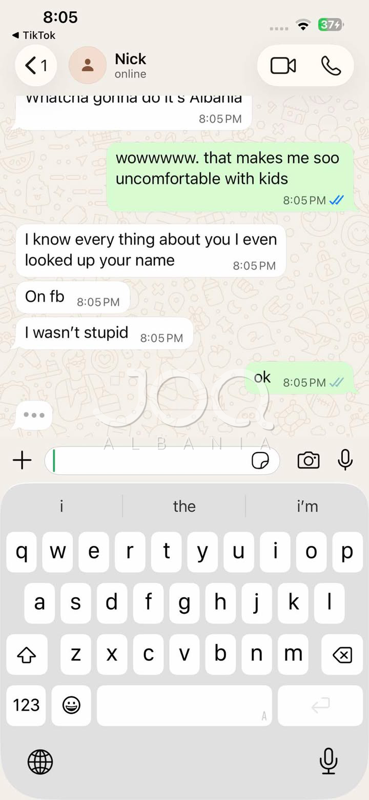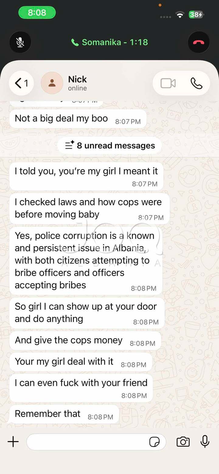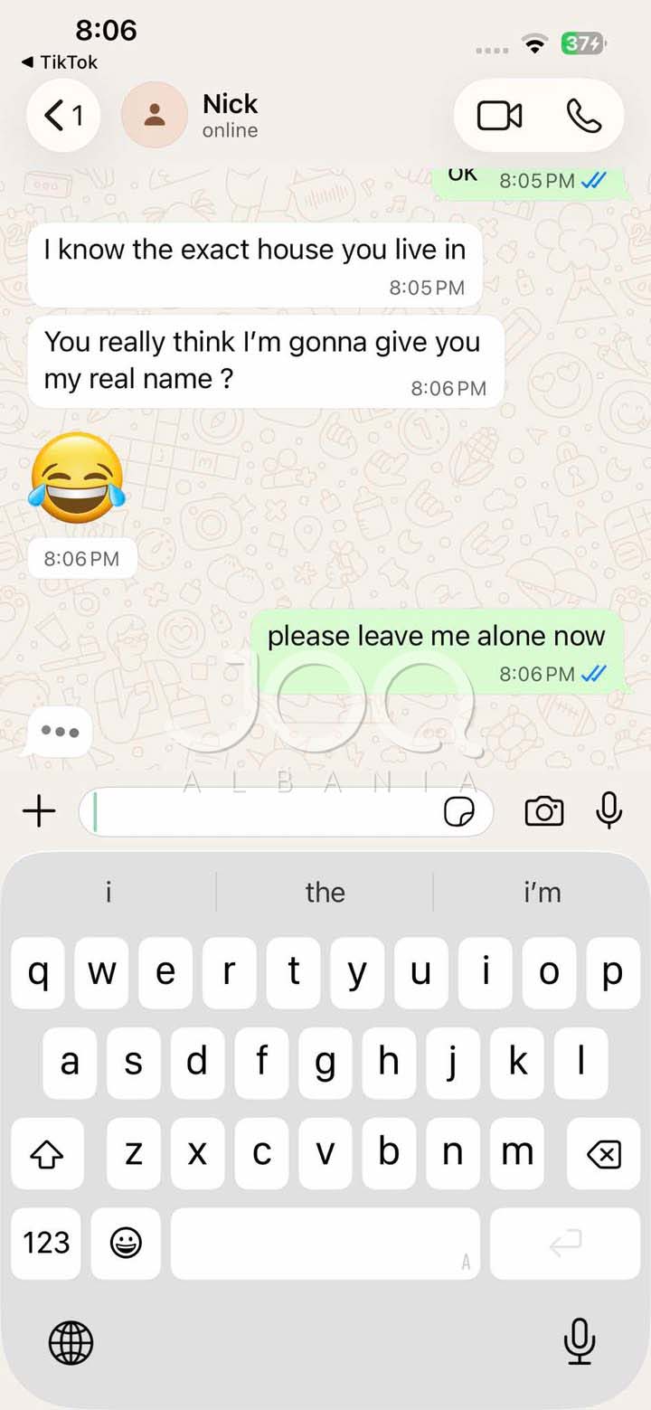 Gruaja, e cila është nënë e vetme e dy fëmijëve të mitur, thotë se ndihet e pasigurt, ndërsa shton se personi në fjalë i ka kërkuar të largohet nga Shqipëria ose të ndryshojë identitet për të qenë e sigurt. Sipas saj, ai ka gjetur profilet e saj në rrjetet sociale dhe ka vijuar me mesazhe kërcënuese. Edhe pse ajo e ka bllokuar, ai i ka thënë se mund ta kontaktojë sërish përmes numrave të tjerë.
