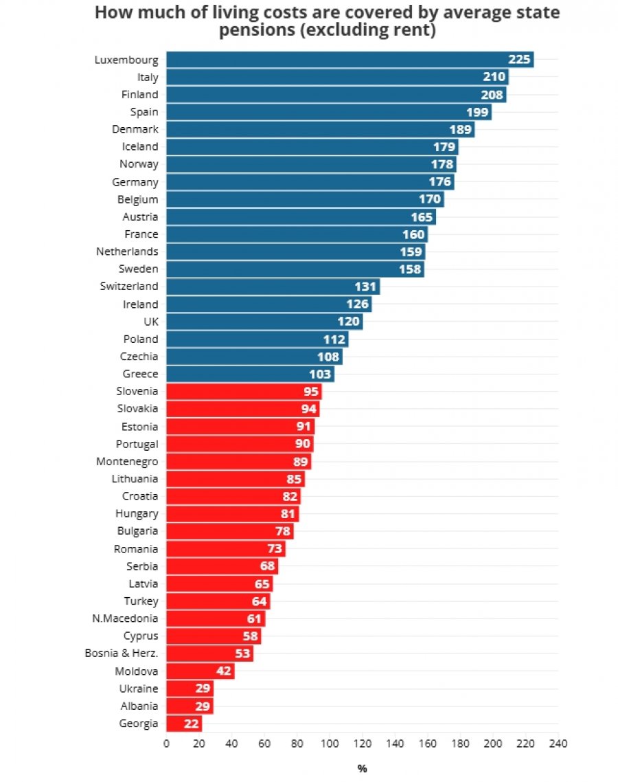Sipas një grafiku të publikuar nga Euronews dhe të bazuar në të dhëna ndërkombëtare, Shqipëria pozicionohet në vendin e parafundit, ku pensioni mesatar mbulon vetëm rreth 29% të shpenzimeve të përditshme të një individi (pa përfshirë qiranë).