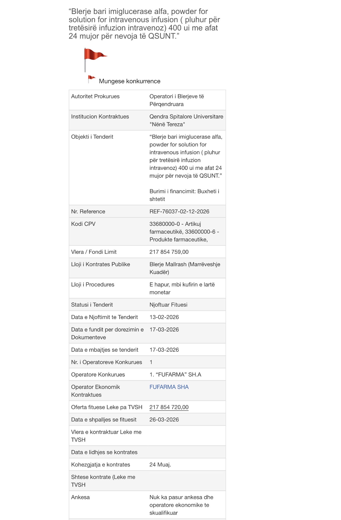 Tenderi është dhënë me 100% të Fondit Limit oligarkut Isuf Berberi me Marrëveshje Kuadër me shkelje për Mungesë Konkurrence, duke kursyer vetëm 30 lekë të reja nga Buxheti i Shtetit.