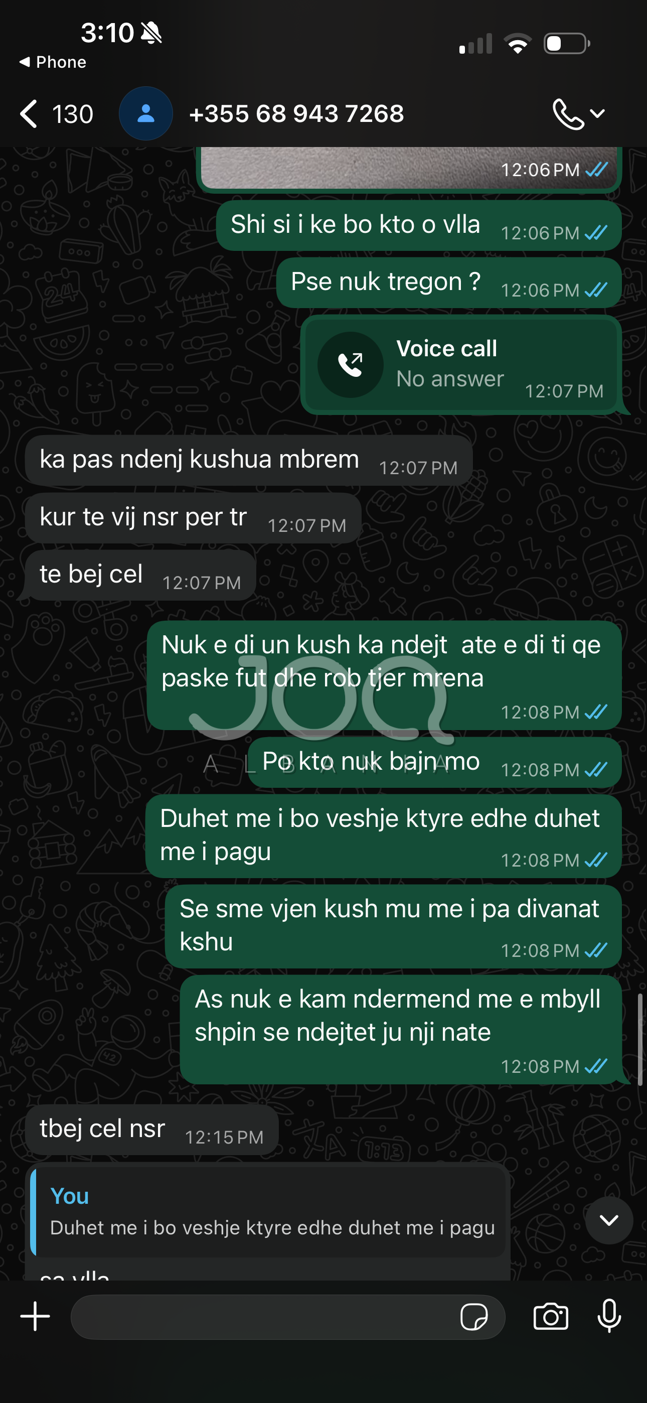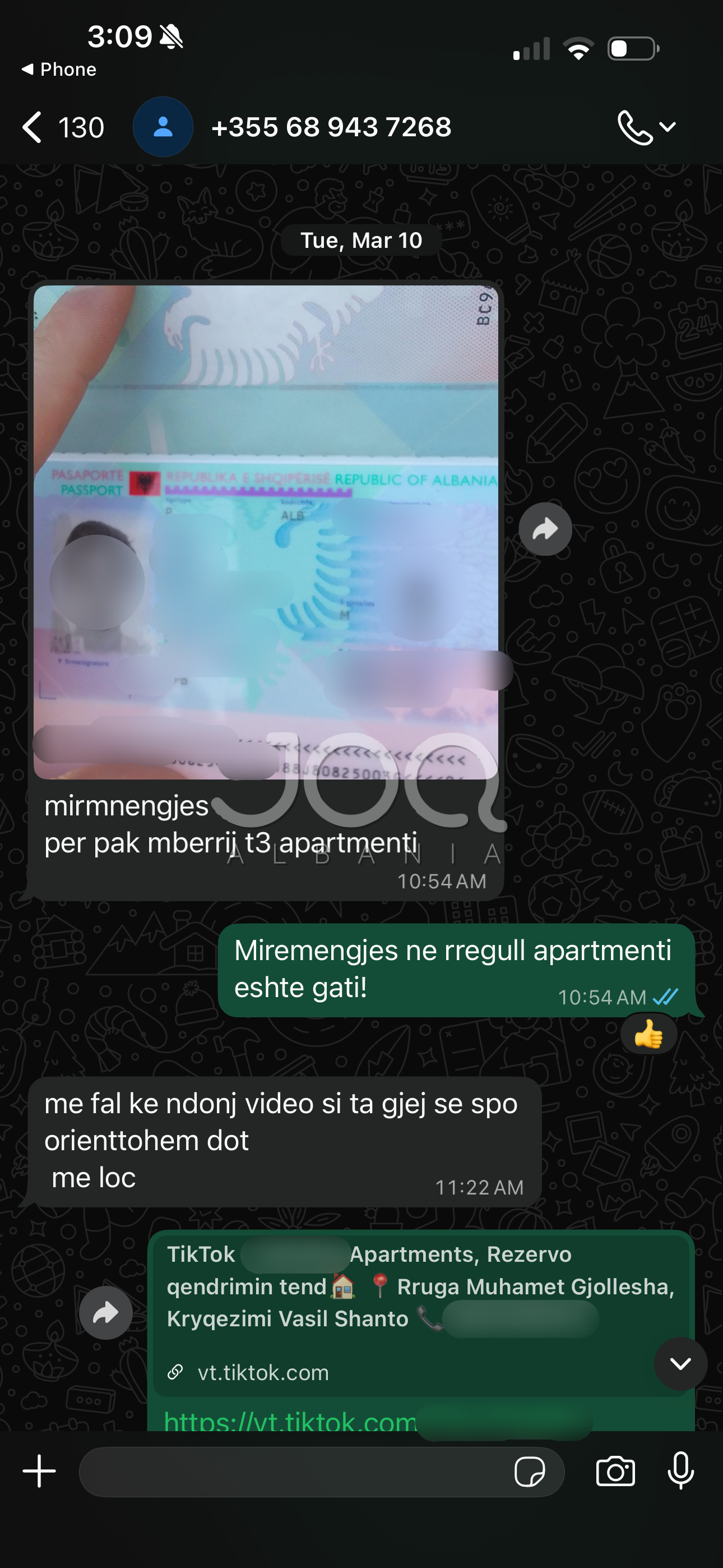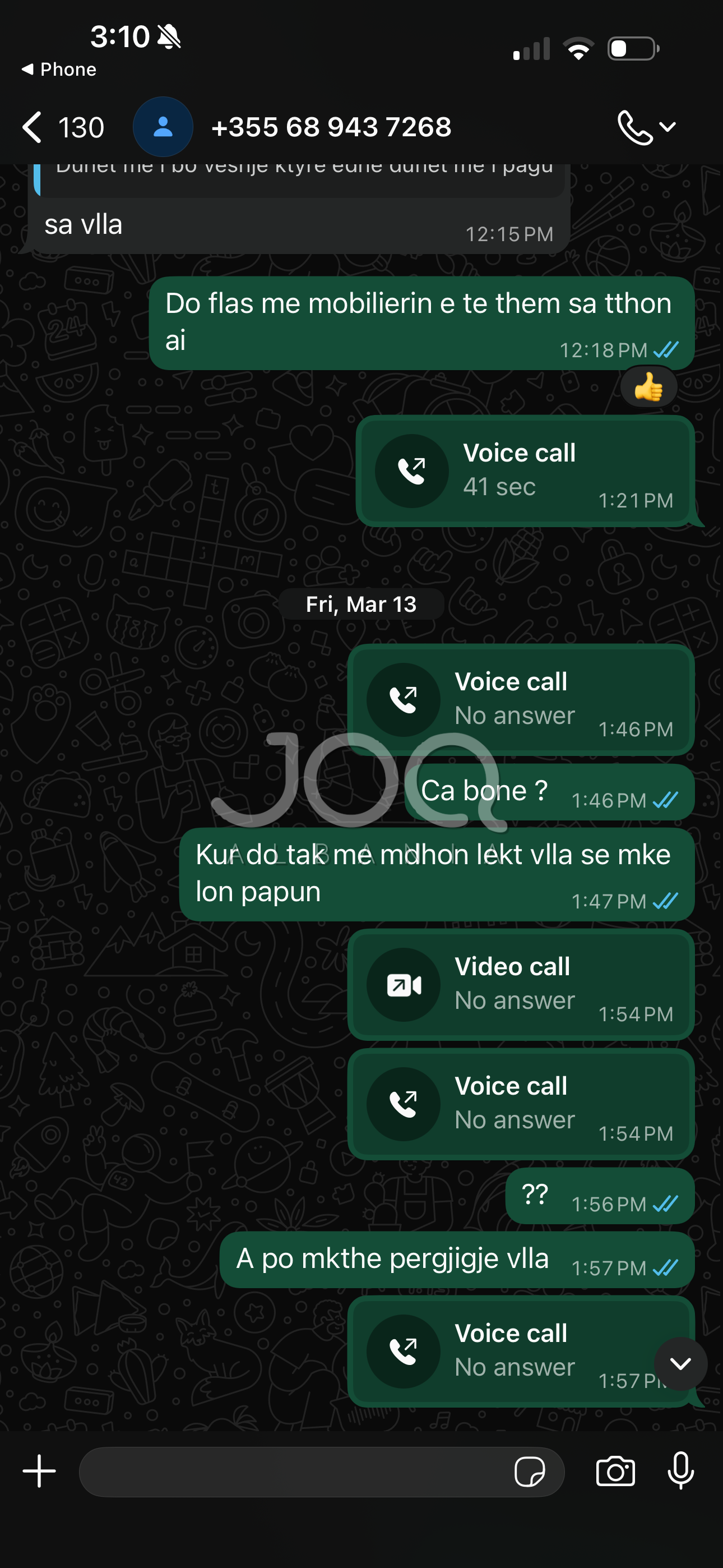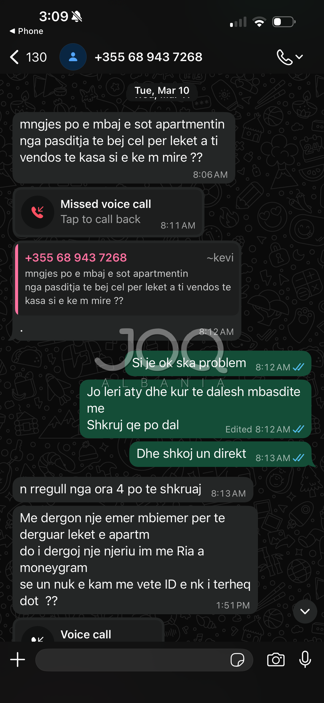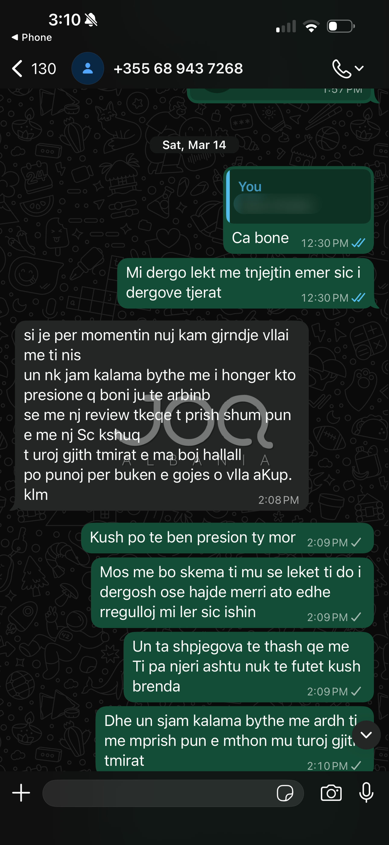 "Përshëndetje JOQ! Uroj të jeni mirë. Doja të denoncoja një djalë me emrin Klajd nga Tirana, i cili ka prenotuar apartamentin dhe e ka dëmtuar tej mase, sikur të kishin qëndruar kafshë brenda. Ai ka djegur setin e divaneve, ka konsumuar cigare dhe lëndë narkotike në apartament, si dhe ka paraqitur një kartë identiteti false që nuk i përket atij. Fatkeqësisht, do të doja shumë ta postonit këtë rast në mënyrë që të tjerët të mos bien pre e këtyre mashtruesve, të cilët janë shtuar tej mase në Tiranë dhe janë bërë tejet problematikë për ne si sipërmarrës. Pavarësisht se nuk ka pranuar të paguajë dëmin minimal që i është kërkuar, gjë që ka sjellë mbylljen e apartamentit për një kohë relativisht të gjatë, ai ka kërcënuar në mënyrë direkte të gjithë stafin. Unë kam bërë denoncim në polici, por doja ta ndaja edhe me pjesën tjetër që të mos përsëritet si rast. Numrat e mashtruesit janë: 0689220975 dhe 0689437268"