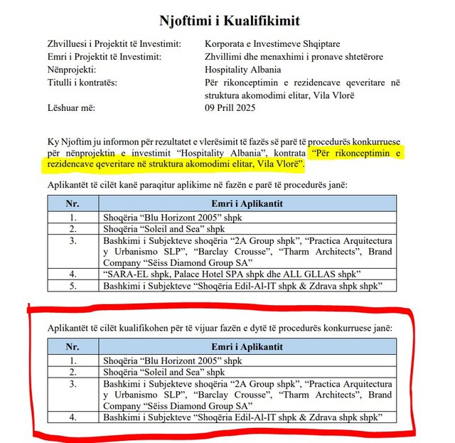 Në listën e emrave të përfolur atëherë u renditën kompani të lidhura me disa prej figurave më të njohura të biznesit dhe politikës në vend: Ardian Kollozi përmes “Blu Horizont 2005”, Alban Xhillari me “Soleil and Sea”, struktura të lidhura me Behgjet Pacollin përmes “2A Group”, si edhe Vëllezërit Dulaku me “Edil-Al-IT” në bashkëpunim me “Zdrava”. Një garë ku emrat ishin të mëdhenj, por informacioni publik për kriteret, pikët dhe procedurën mbeti i vogël.