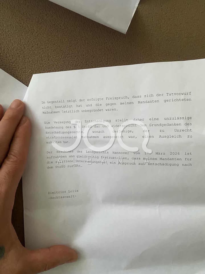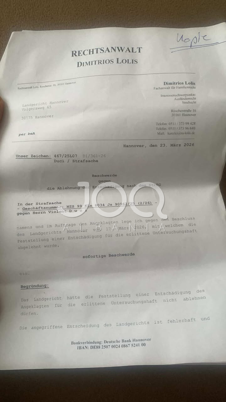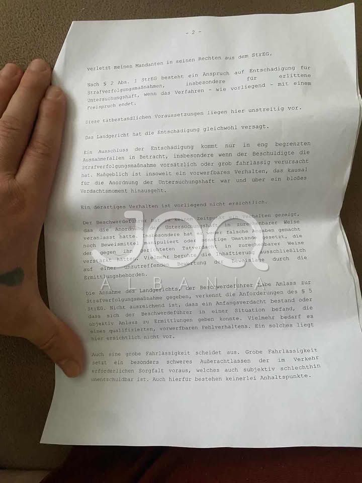 Sipas dokumentit, avokati argumenton se klienti i tij është shpallur i pafajshëm (Freispruch) dhe, sipas ligjit gjerman për kompensimin në raste arrestimi të pajustifikuar, ka të drejtë të përfitojë dëmshpërblim nga shteti.