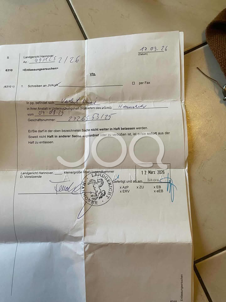 Dokumenti i parë, i datës 17 mars 2026, është një urdhër zyrtar nga Gjykata e Hannover-it që kërkon lirimin e menjëhershëm të Violent Duçit nga paraburgimi.