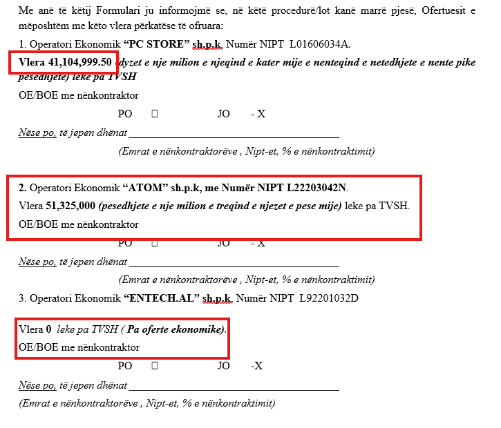 Vlera fituese e shpallur nga OSHEE është 51,325,000.00 lekë të reja (pa TVSH), ose rreth 615 milionë lekë të vjetra me TVSH. Nga një llogaritje e thjeshtë matematikore, rezulton se fituesi ka ofruar rreth 93.6% të fondit limit (i cili ishte 54,806,666.00 lekë). Kjo përqindje kaq e lartë, ku vlera e kontraktuar është pothuajse e barabartë me tavanin e parashikuar nga shteti, shërben shpesh si sinjali i parë i mungesës së garës reale.
