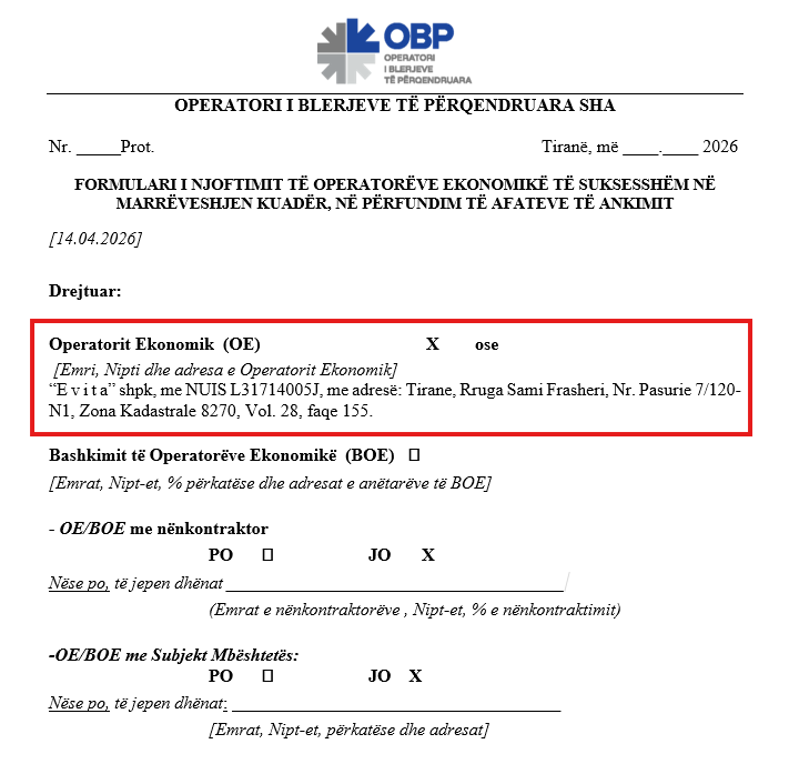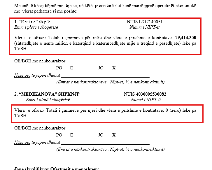 Duke studiuar dokumentet e kësaj procedure (REF-74973-02-02-2026), skandali thellohet. Në "garë" kanë marrë pjesë vetëm dy firma: "Evita" e Allajbeut dhe një kompani tjetër, e cila në mënyrë të dyshimtë nuk ka ofruar asnjë vlerë monetare. Kjo është skema klasike e përdorur për të plotësuar numrin e pjesëmarrësve në letër, ndërkohë që rruga për fituesin është shtruar me tapet të kuq.