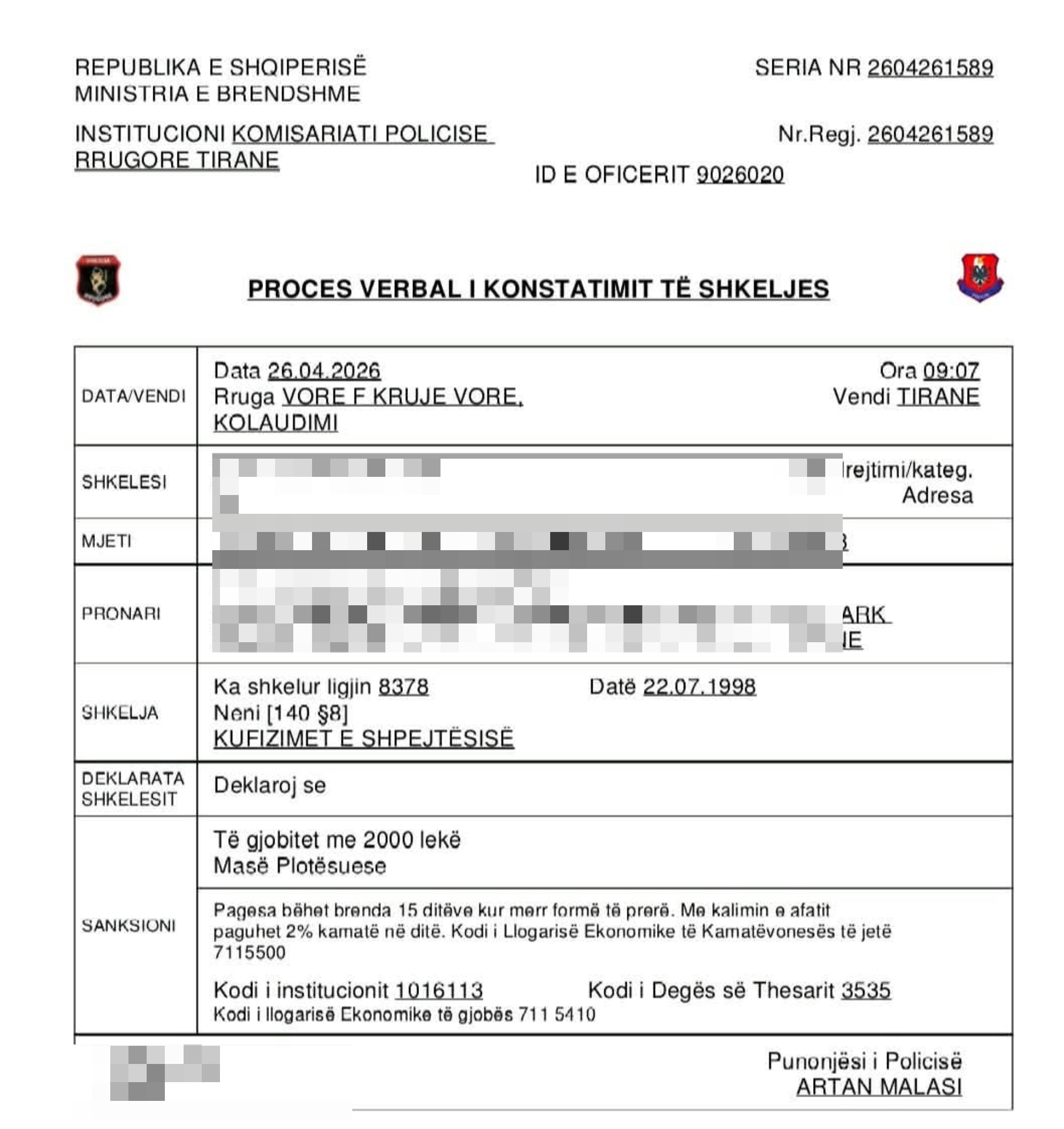 Qytetari i cili punon si shofer pranë një fabrike, thotë se më datë 12 prill 2026, në orën 09:07, është gjobitur me 2000 lekë pa u ndaluar nga efektivët e policisë për kontroll, në pikën e kolaudimit në Rinas.